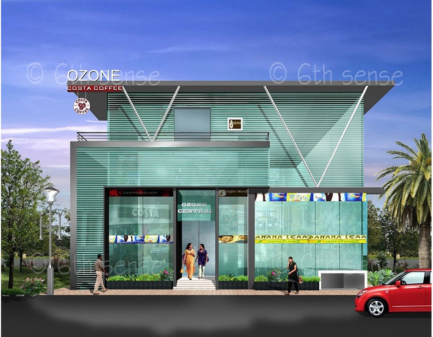 A small commercial 3 storied building of area 50,000 square feet with full glassed front façade with small balcony space in the third floor and landscaping in the front which make the whole building look majestic and appealing.